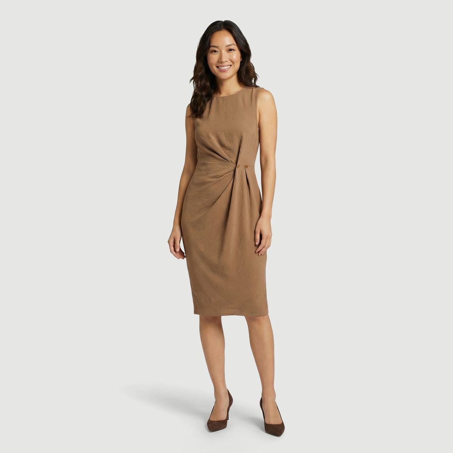 Economia de R$ 31,00Vestido midi Urbano sem mangas, em bege liso, com proposta minimalista e elegante. Confeccionado em 100% poliéster, possui decote redondo e drapeado lateral com prega, valorizando o caimento. O aviamento com metais dourados na lateral acrescenta sofisticação, enquanto o zíper nas costas facilita ao vestir, ideal para compor produções do trabalho a ocasiões sociais.