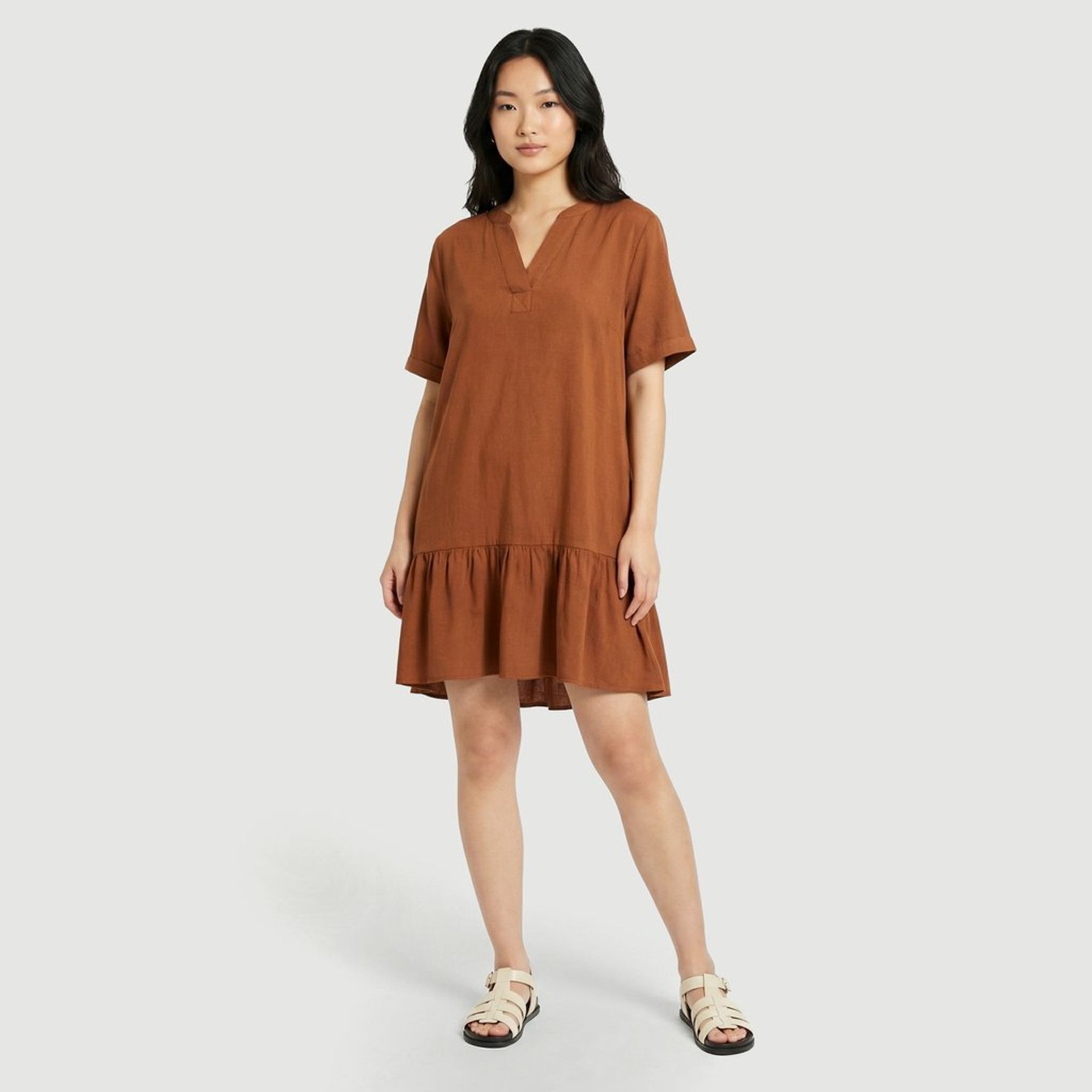Economia de R$ 10,00Vestido feminino Viva Casual em cor caramelo, liso (sem estampa) e com modelagem solta para um visual prático e versátil. Possui manga curta e gola V, trazendo leveza ao look.