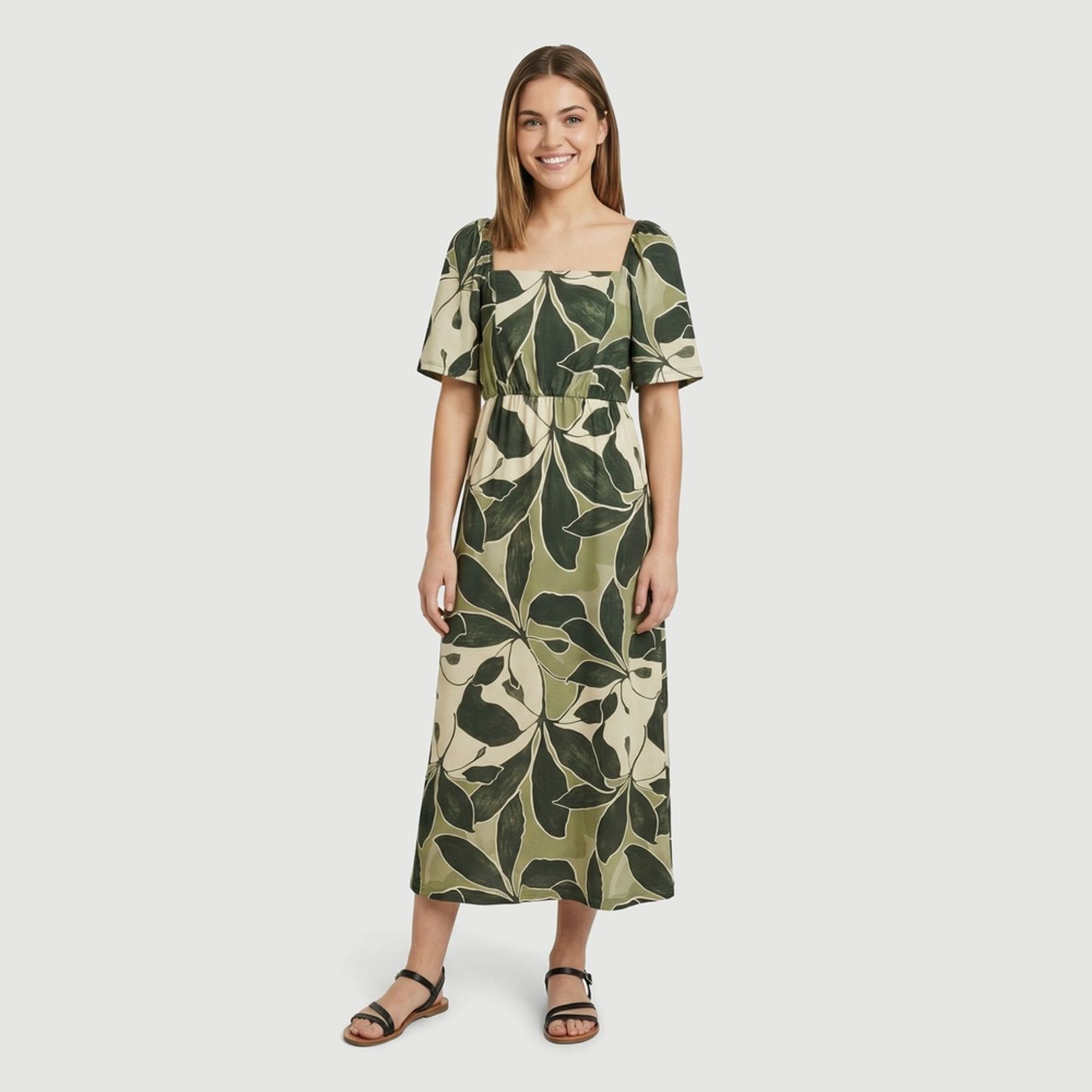 A estampa de folhagens em tons de verde e bege traz um visual tropical e elegante, fácil de combinar com sandálias, rasteiras ou tênis. A cintura com elástico ajuda a marcar a silhueta, enquanto o lastex nas costas melhora o ajuste ao corpo.