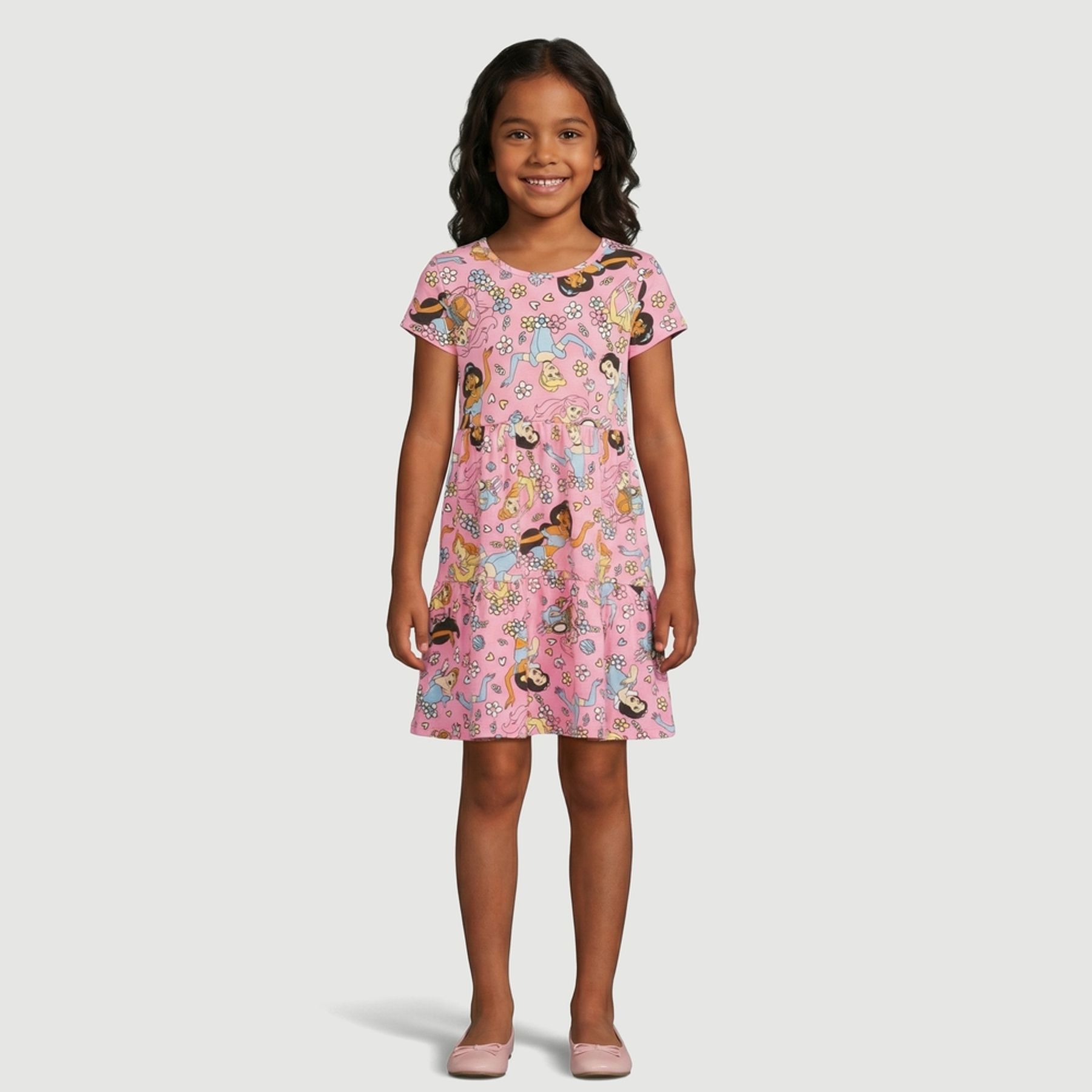Economia de R$ 6,00Vestido infantil Disney em malha 100% algodão, com toque macio e respirável. A modelagem tem gola redonda, manga curta e recorte na cintura com saia franzida/rodada, oferecendo liberdade de movimento.