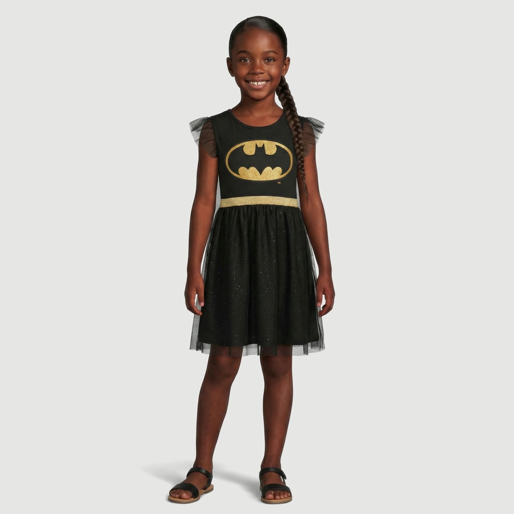 O destaque fica para o logo do Batman em amarelo com efeito brilhante na parte frontal. Possui gola redonda, mangas curtas com babados em tule, faixa brilhante na cintura e saia rodada com sobreposição de tule e leve efeito glitter, além de barra com acabamento em tule.