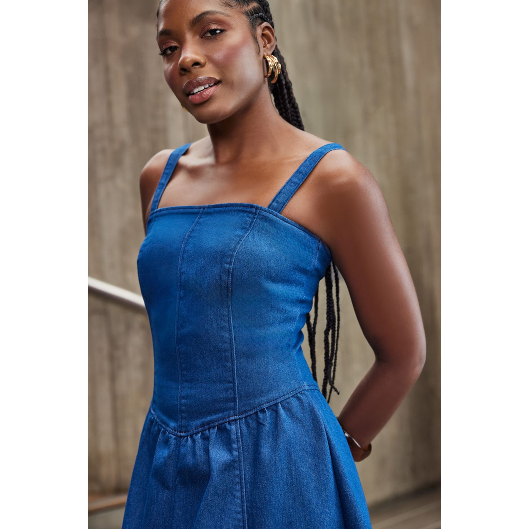 Economia de R$ 20,00Vestido jeans feminino sem manga com alça em jeans escuro liso – modelagem reta, comprimento curto, alças médias, design clean e versátil para ocasiões casuais.