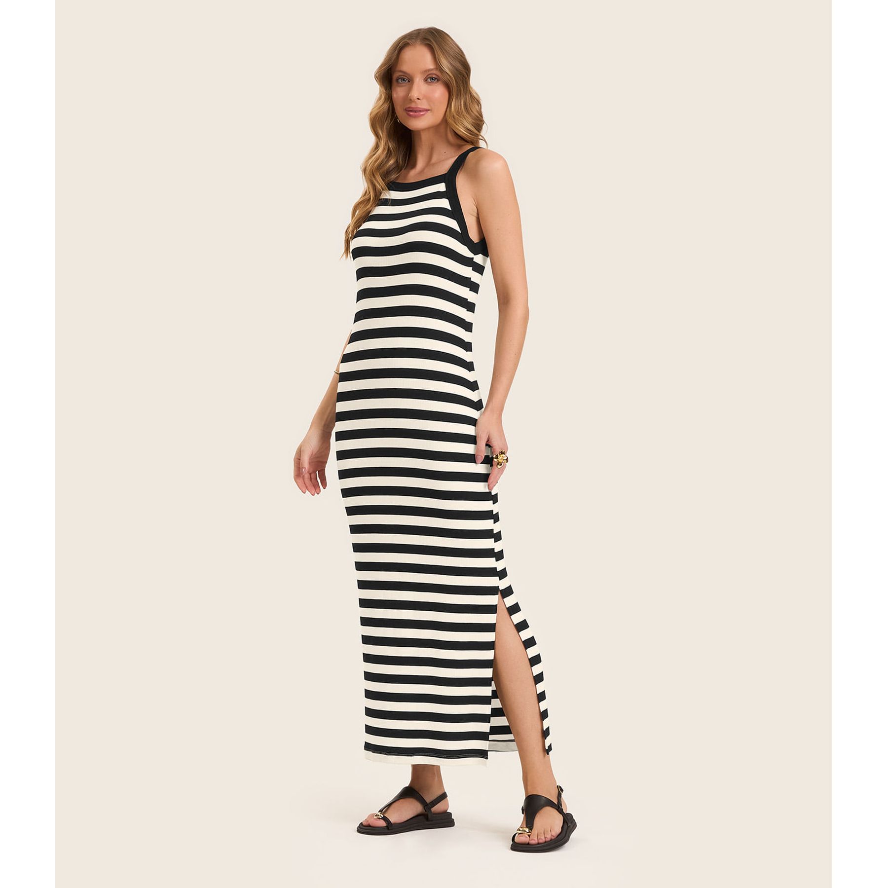 Vestido Feminino Midi Básico Canelado Listrado Preto - Viva