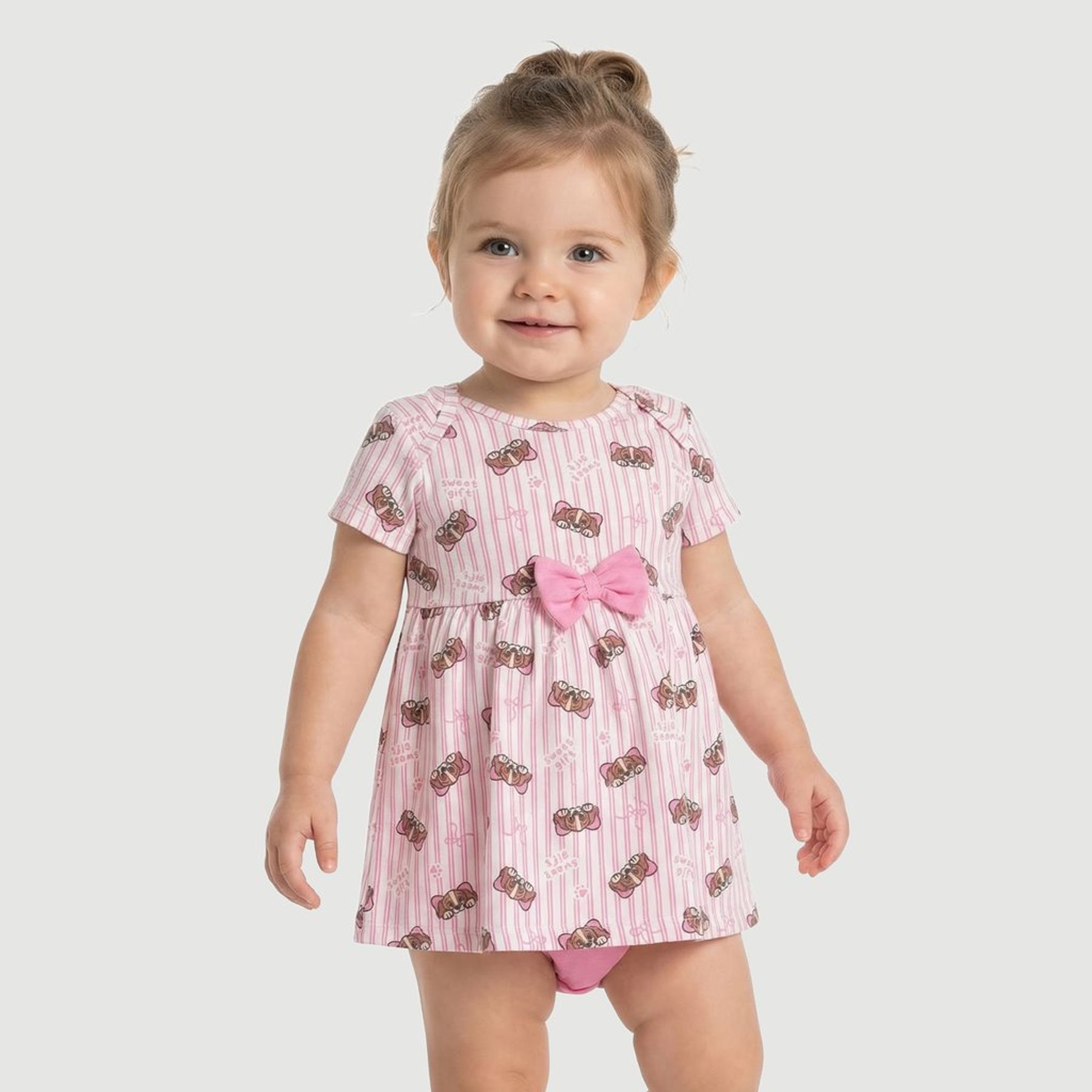 Vestido Infantil Manga Curta Estampado Biju Kids Rosa